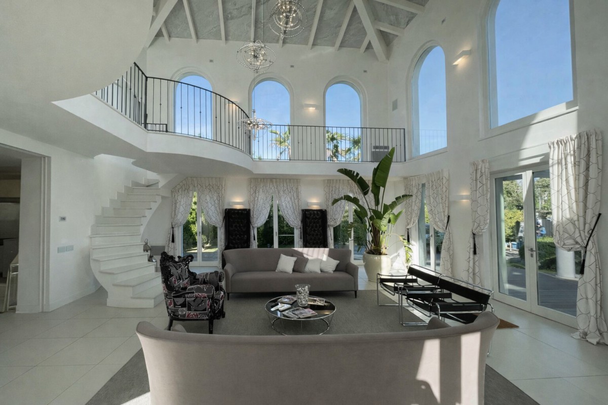 On the ground floor, a magnificent 65 sqm living room welcomes you, featuring an impressive 8-meter ceiling height, enhanced by large glass windows and a refined marble ceiling. The living area continues with a fully open-plan kitchenseamlessly connected to the dining area, two bathrooms, and a charming 60 sqm indoor living space overlooking the pool, ideal for relaxation and entertaining.