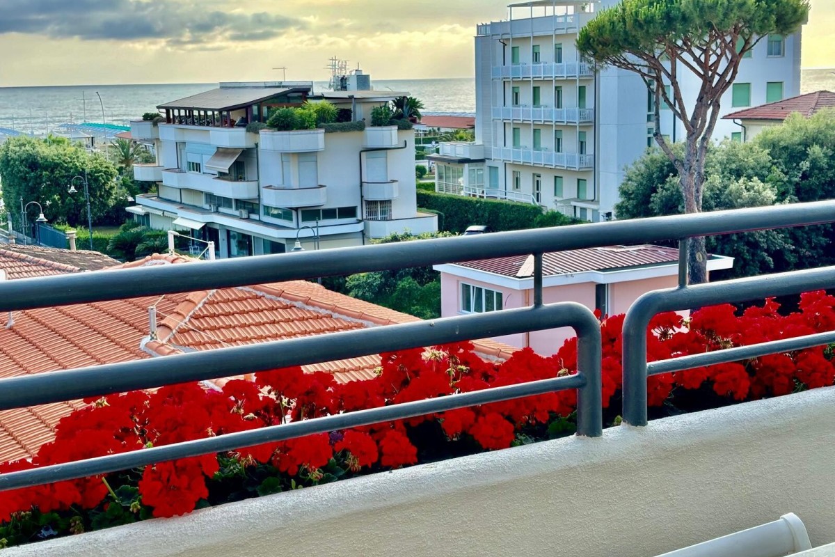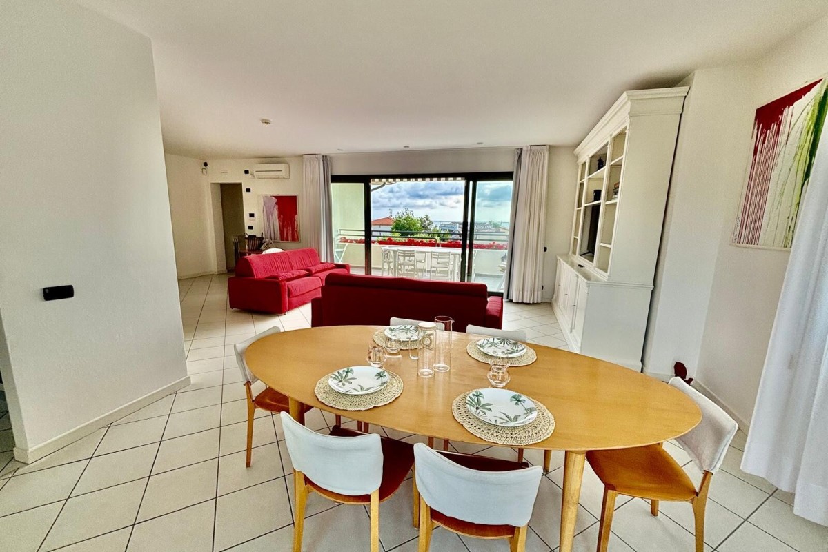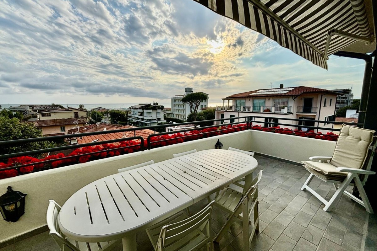 A 3rd-floor penthouse apartment of approximately 140 square meters, centrally located in Le Focette, just 100 meters from the sea, with splendid sea and mountain views.