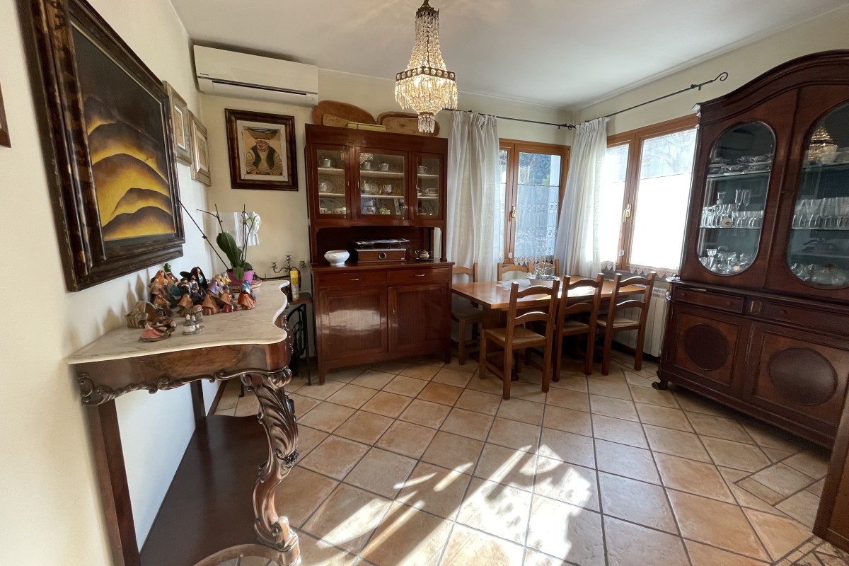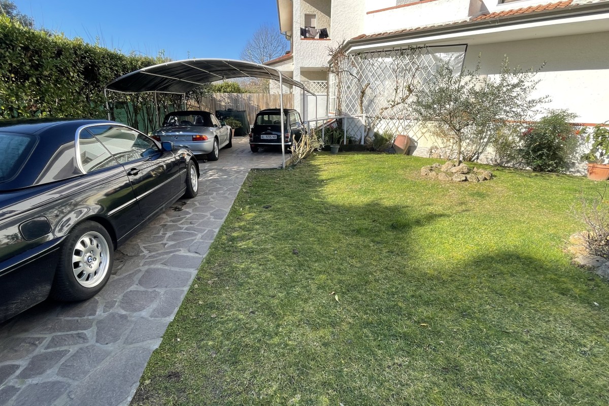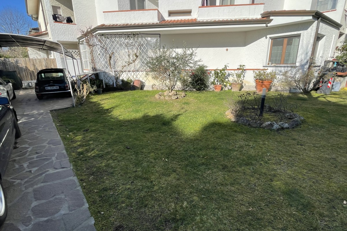 La casa dispone di due ingressi, quello principale dal giardino in comune e quello carrabile, completamente indipendente e con possibilità di parcheggiare fino a tre auto, corredato anche questo da giardino e veranda attrezzata.