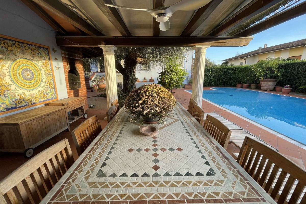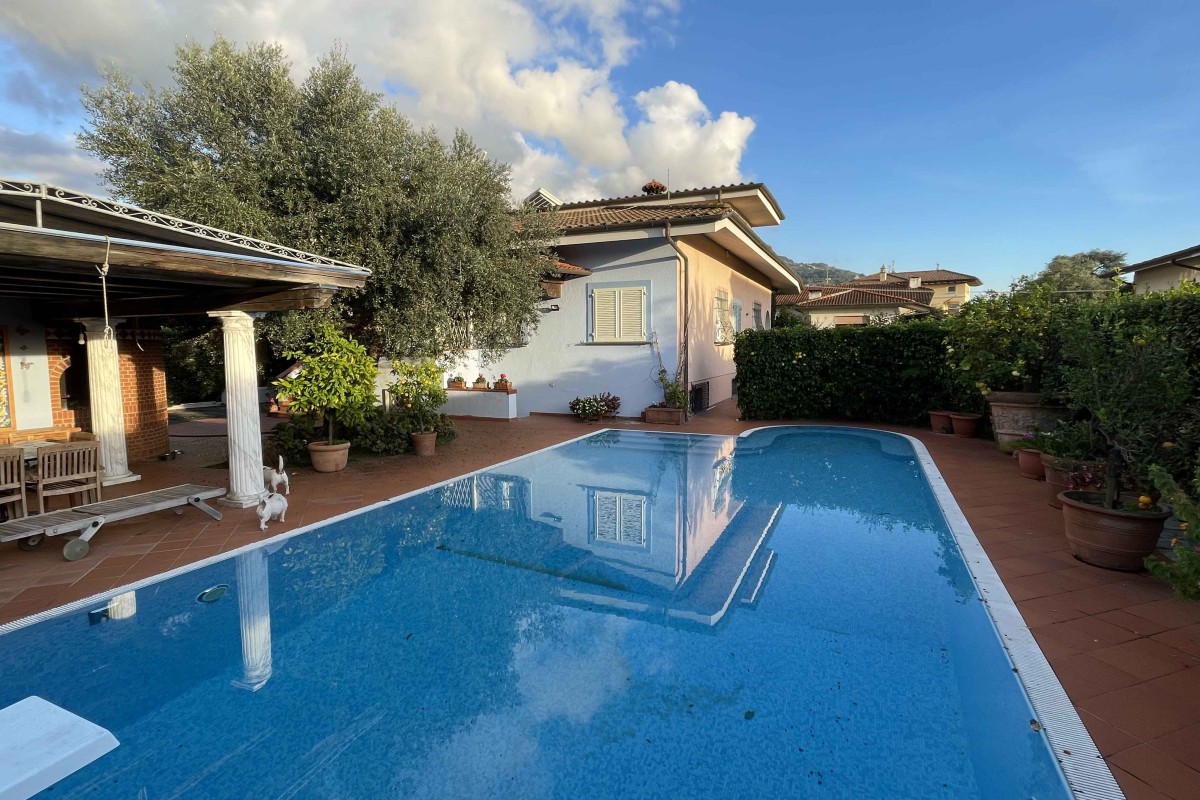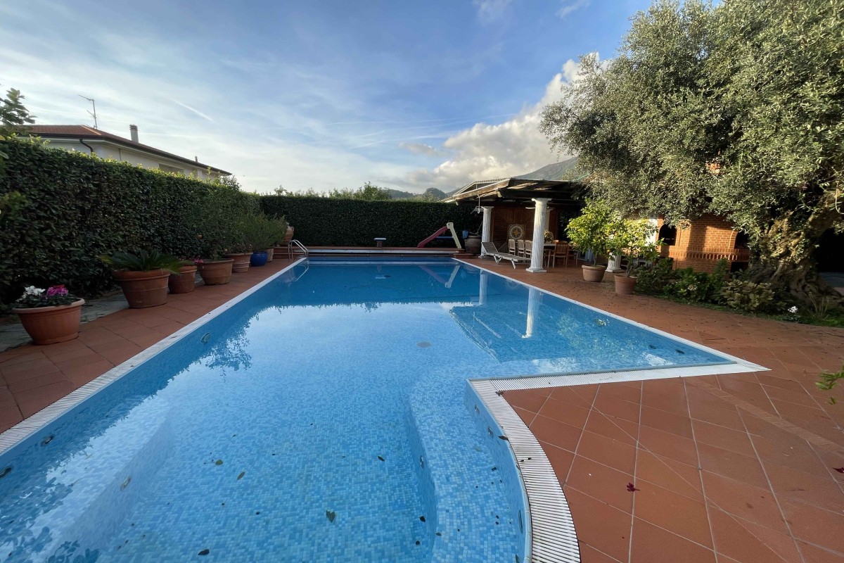 In  zona residenziale tranquilla e ben servita, a soli 1 km da Querceta e a pochi minuti da Forte dei Marmi, è disponibile questa villa singola con piscina, una proprietà elegante e completa di ogni comfort. La casa è inserita in un lotto di 893 mq, con un ampio giardino curato che circonda l’abitazione e valorizza la zona piscina.